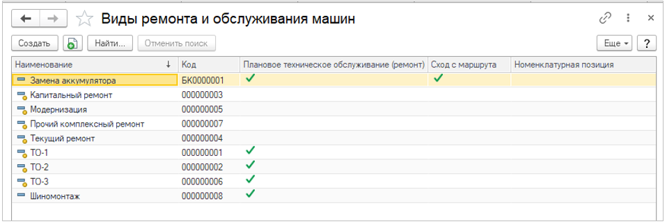 Справочник Виды ремонта и обслуживания машин (раздел Обслуживание и ремонты - группа Настройки и справочники) предназначен для хранения сведений о видах технического обслуживания и ремонта.