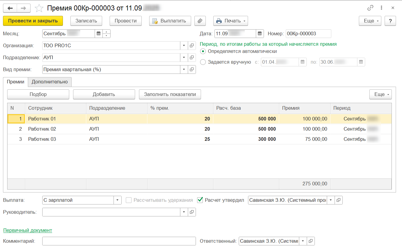 В 1С:Зарплата и управление персоналом для Казахстана, ред. 3.1 начисление (расчет и регистрация) премии может отражаться непосредственно при расчете начислений за отработанный период или в течение отчетного периода отдельным документом Премия (в разделе Зарплата).
