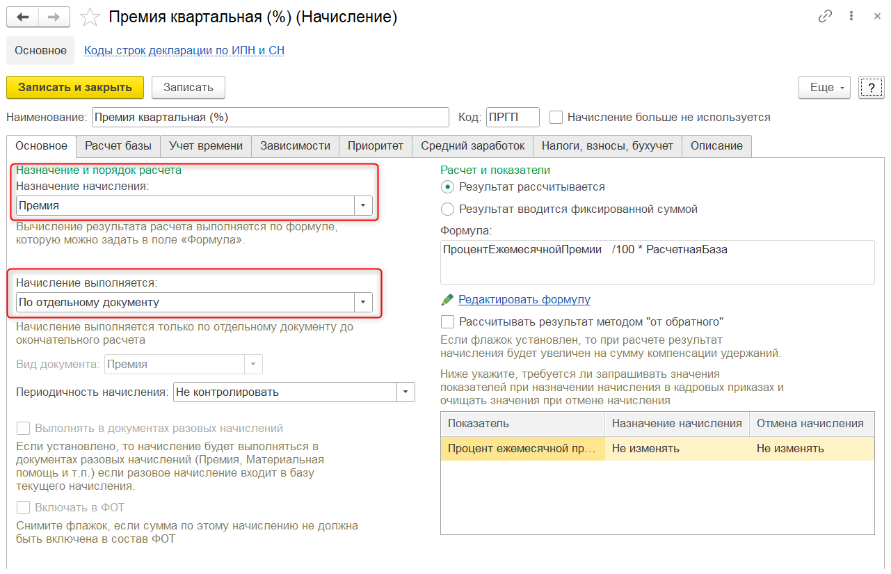 Документ доступен для использования при условии, что в списке начислений присутствует вид расчета с назначением Премия или Прочие начисления и выплаты, у которого в настройках Начисление и порядок расчета в поле Начисление выполняется установлено значение По отдельному документу.
