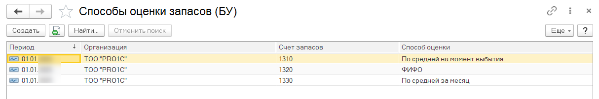 В случае, если в регистре сведений Способы оценки запасов (БУ) отсутствуют записи или для счета не задано значение способа оценки, по умолчанию применяется способ По средней на момент выбытия.