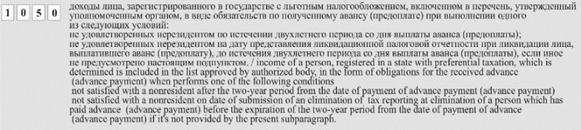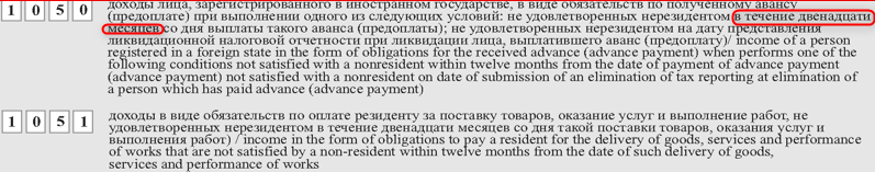 - Добавлен код 1051 – доходы в виде обязательств по оплате резиденту за поставку товаров, оказание услуг, выполнение работ не удовлетворенных в течение 12 месяцев.