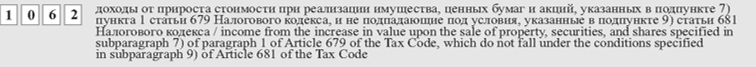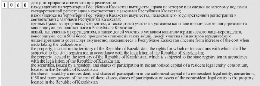 - Добавлен код 1062 – доходы от прироста стоимости при реализации имущества, ценных бумаг и акций, указанных в пп. 7) п. 1 ст. 679 НК РК и не подпадающие под условия, указанные в пп. 9) ст. 681 НК РК.