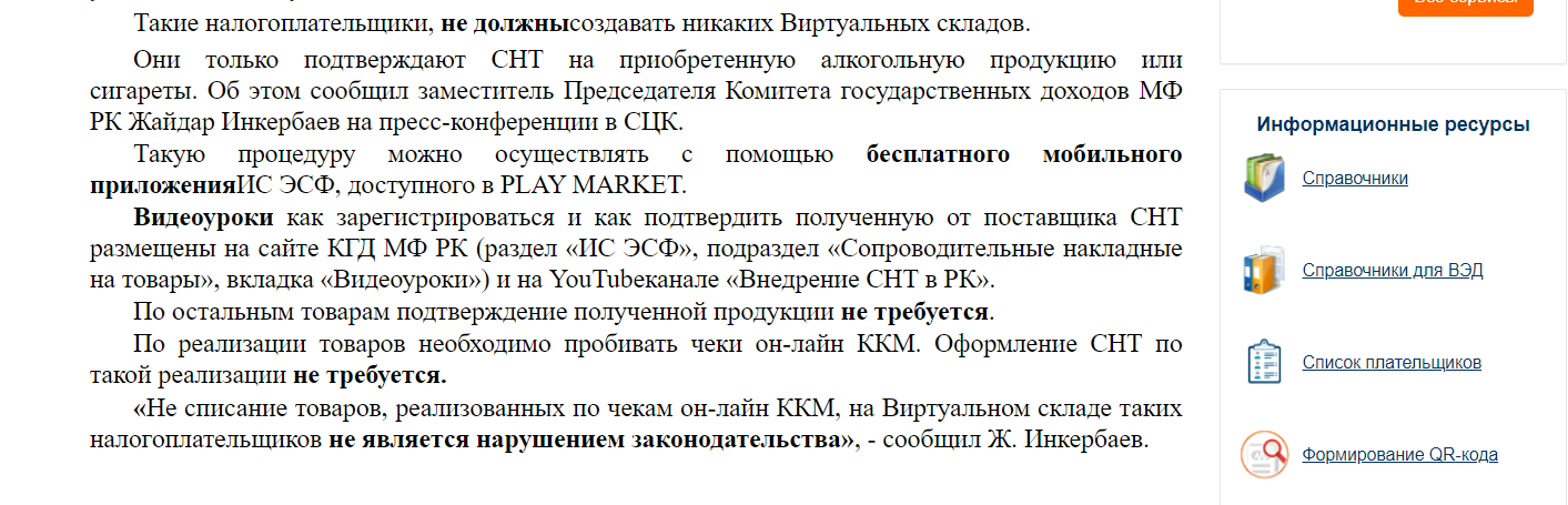 Комитет государственных доходов МФ РК опубликовал на своем официальном интернет-ресурсе разъяснение касательно работы розничных реализаторов с СНТ и модулем ИС ЭСФ «Виртуальный склад».